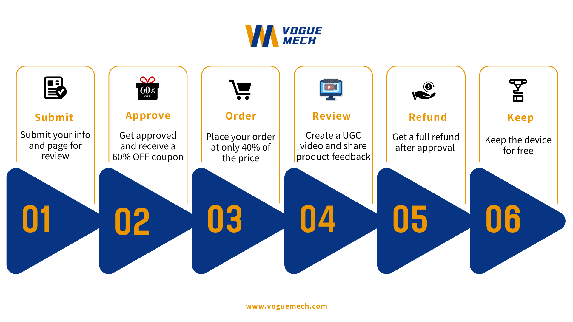 As long as your application is approved, you may receive a 60% off coupon which can be used to buy machine you desired.Having placed the order at 40% price, Voguemech will complete the gift delivery within 30 working days.