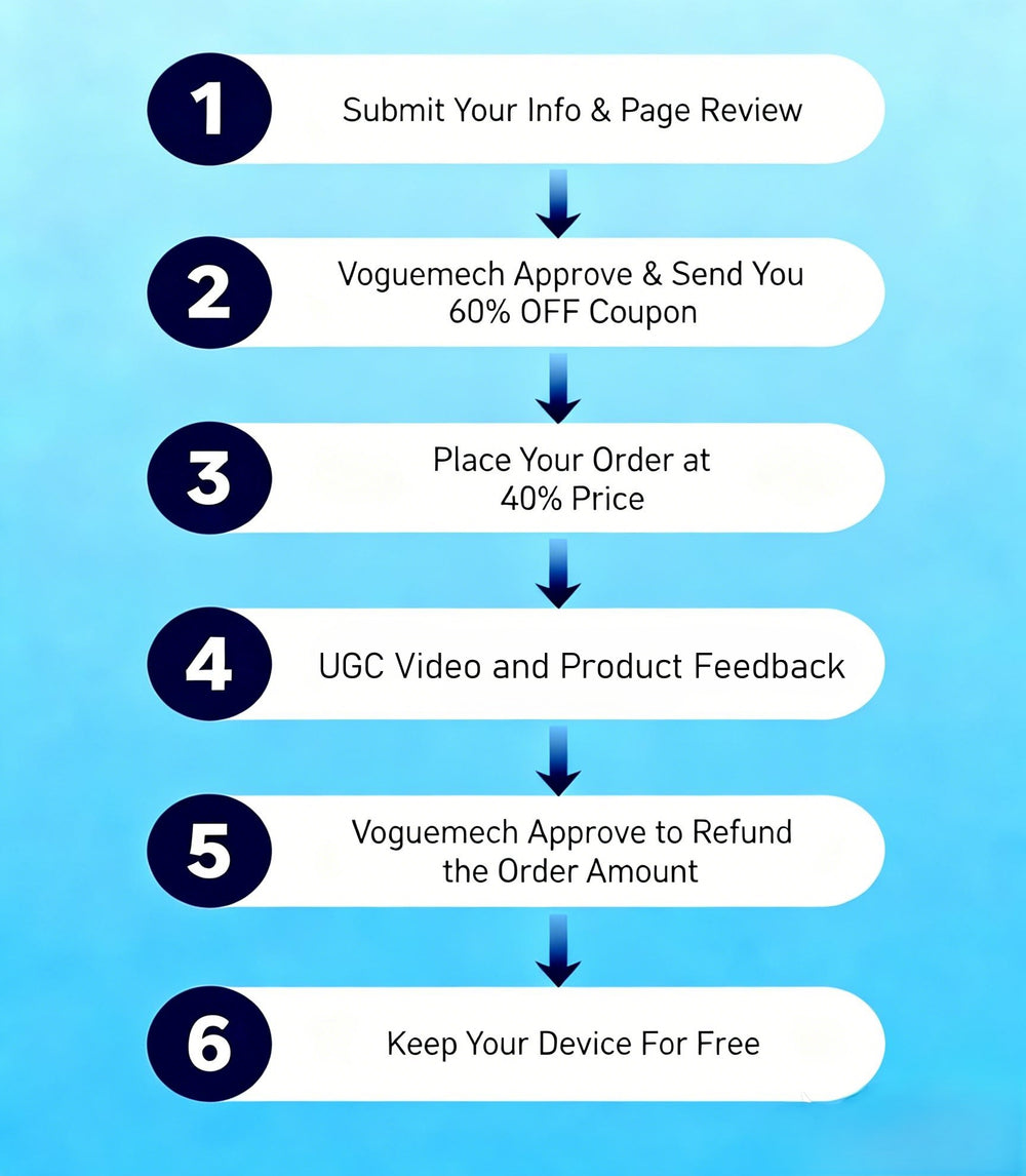 Having placed the order at 40% price, Voguemech will complete the gift delivery within 30 working days. After receiving the product, you need to shoot and submit a feedback video within 30 working days;