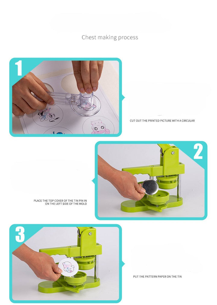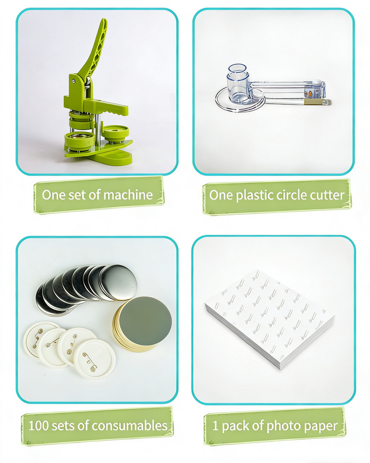 - Comprehensive Kit, Ready to Use: 1 x pin machine, 1 x 25/32/58 mm button molds, 1 x circle paper cutters, 100 x 25/32/58 mm iron bottom parts, 100 x 25/32/58 mm plastic bottom parts, 100 x 25/32/58 mm transparent films, a packet of photo paper.