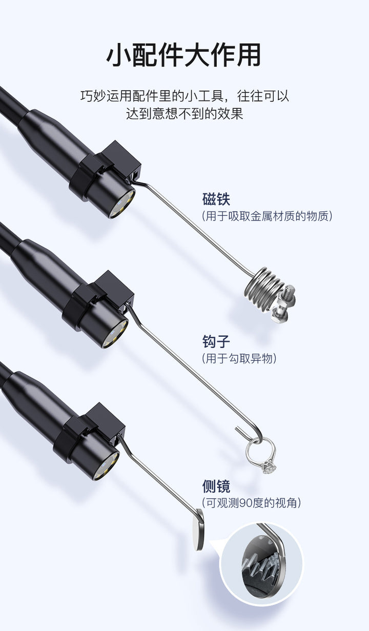- Double Lens, Double Perspective: This double-lens endoscope camera features 1 front camera and 1 side cameras, providing omni-directional visual guidance to help you quickly and accurately identify the cause of the problem.